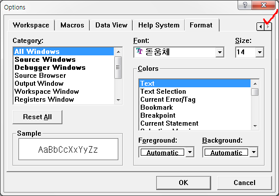 Tools - options 에 들어가서 화살표를 눌러 오른쪽 끝까지 간다.