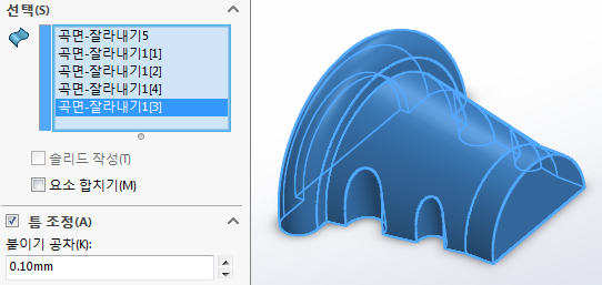 '곡면 붙이기'가 끝나면 곡면 바디가 1개로 되어 있다.