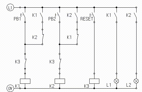 스위치 PB1이나 PB2를 누르면 각각 램프가 점등되는 회로도이다.