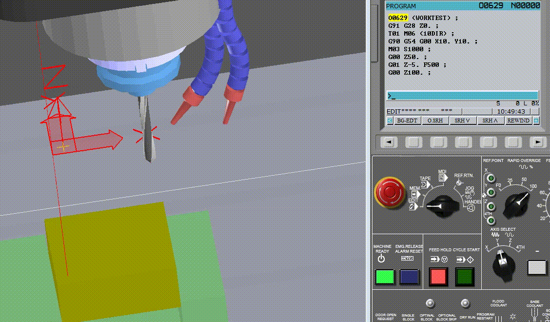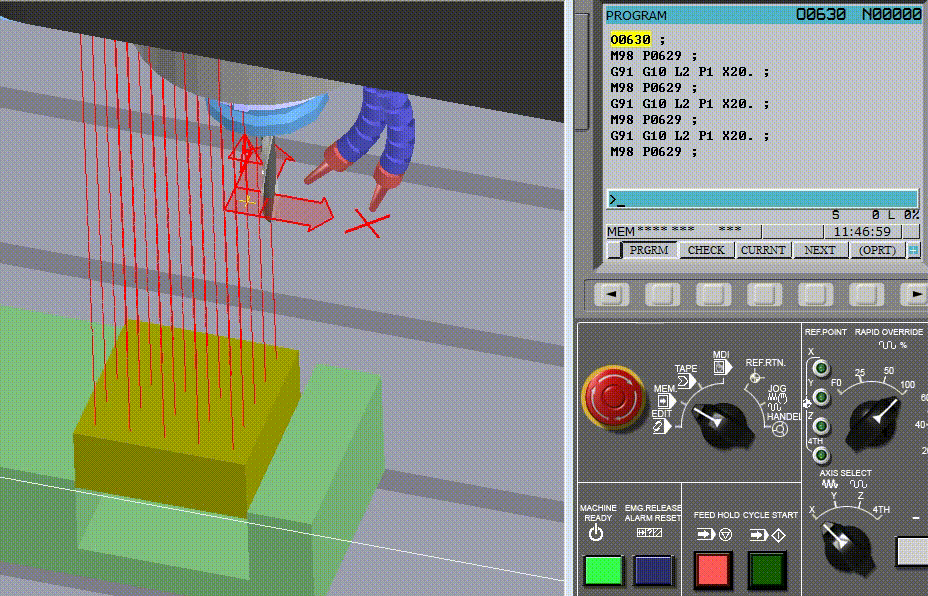 좀 더 응용해서 X축으로 5번 작업하는 것을 Y축방향으로 5번 연속으로 절삭하는 작업을 해본다.