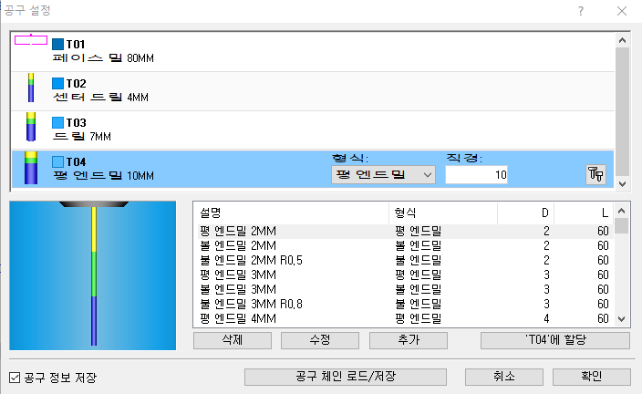 이번에는 4번에 직경10mm짜리 평엔드밀을 장착한다.