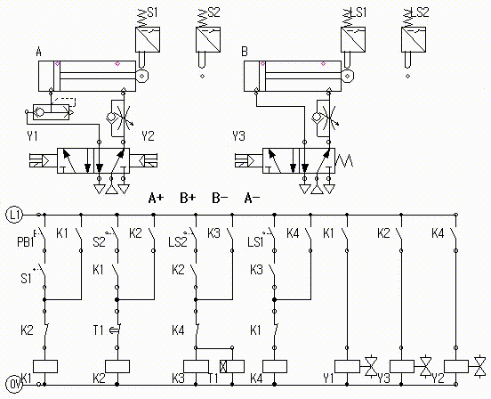 실린더 B가 후진해서 리밋스위치 LS1의 접점이 붙어서 신호가 발생한다.