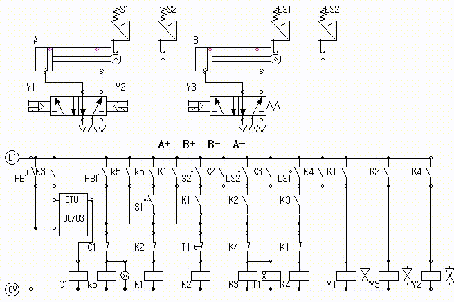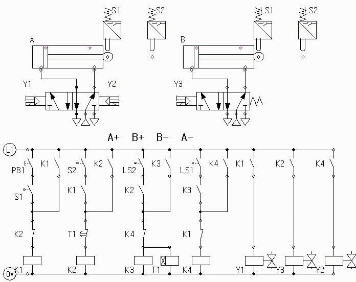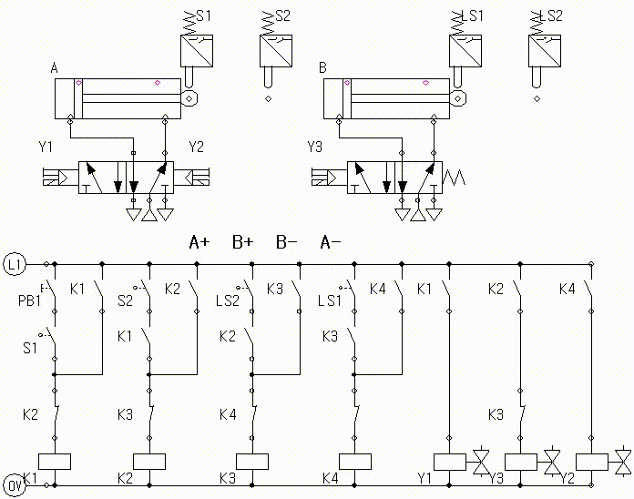 실린더 B는 전진운동을 완료하면 일단 LS2의 접점이 붙는다.