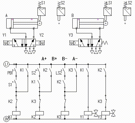 실린더 B가 후진해서 리밋스위치 LS1의 접점이 붙어서 신호가 발생한다.
