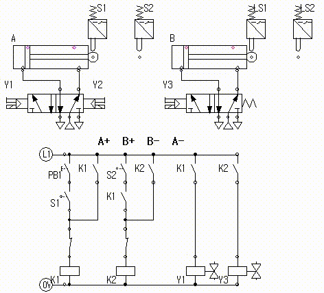 릴레이 K3의 b접점은 편솔(Y3)의 신호를 끊어주어 실린더 B가 후진하도록 한다.