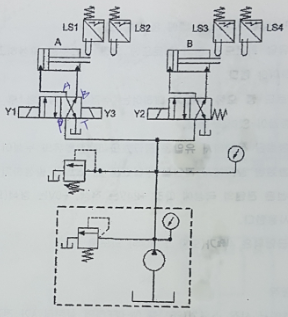 가. 주어진 유압 회로도와 전기 회로도에 의해 시스템을 구성하고, 다음과 같은 동작조건을 만족하여야 한다.