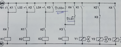 K4가 여자되어서 b접점은 모든 접점을 끊어버리고 a접점은 실린더 A를 후진시켜서 LS1의 접점이 붙게 된다.