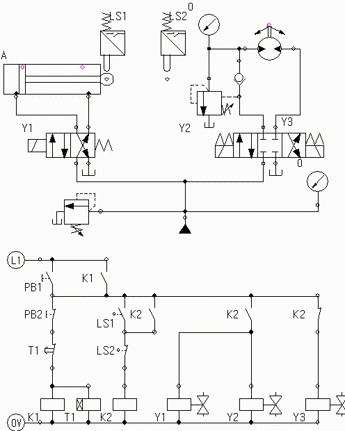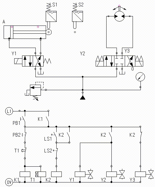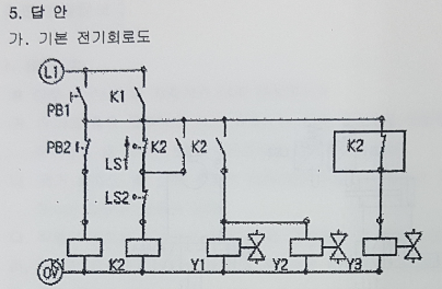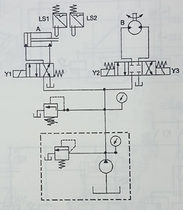 1) 초기상태에서 시작 스위치(PB1)를 ON-OFF하면 실린더 A의 전진운동과 유압모터 B가 축방향에서 볼 때 시계방향으로 회전운동이 동시에 시작되고, 실린더 A가 전진완료 후 LS2 리밋 스위치가 동작하면 실린더 A의 후진운동과 유압모터 B의 반 시계방향으로 회전운동이 동시에 이루어진다. 이와 같이 연속동작이 되어야 한다.