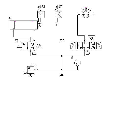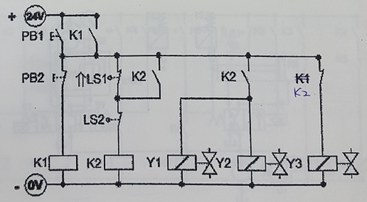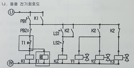 1) 초기상태에서 시작 스위치(PB1)를 ON-OFF하면 실린더 A의 전진운동과 유압모터 B가 축방향에서 볼 때 시계방향으로 회전운동이 동시에 시작되고, 실린더 A가 전진완료 후 LS2 리밋 스위치가 동작하면 실린더 A의 후진운동과 유압모터 B의 반 시계방향으로 회전운동이 동시에 이루어진다. 이와 같이 연속동작이 되어야 한다.