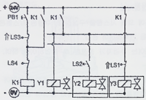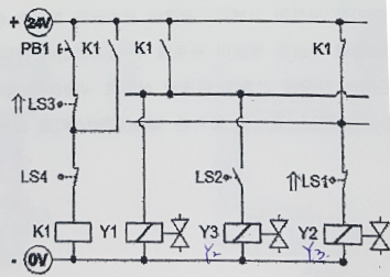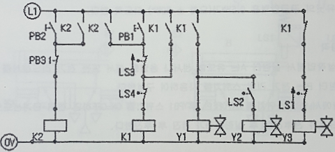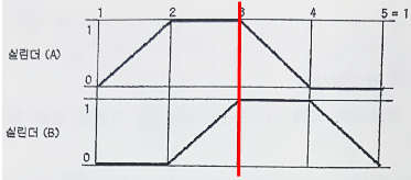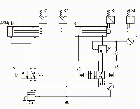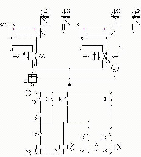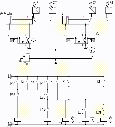 초기상태에서 시작 스위치(PB1)를 ON-OFF하면 실린더 A가 전진하고 실린더 A가 전진완료 후 실린더 B가 전진하며 실린더 B가 전진완료 후 실린더 A가 후진하고 실린더 A가 후진완료 후 실린더 B가 후진한다.