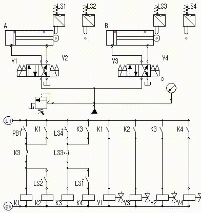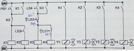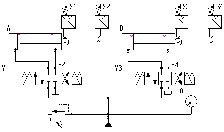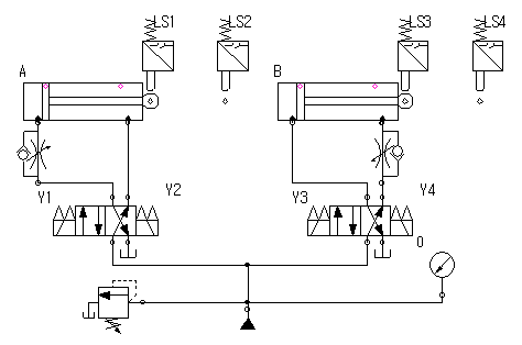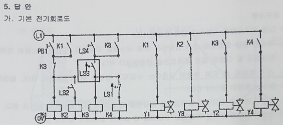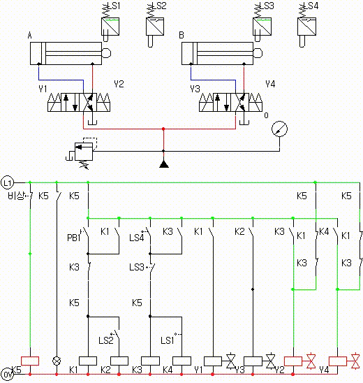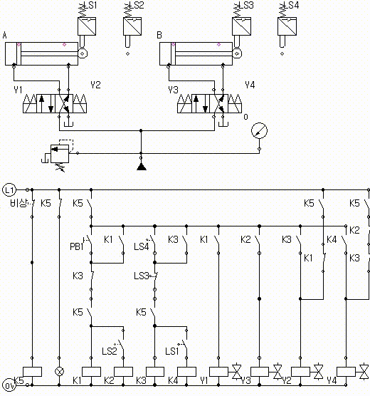 1) 초기상태에서 시작 스위치(PB1)를 ON-OFF하면 실린더 A가 전진하고 실린더 A가 전진완료 후 실린더 B가 전진하고 실린더 B가 전진완료 후 실린더 A가 후진하고 실린더 A가 후진완료 후 실린더 B가 후진한다.
