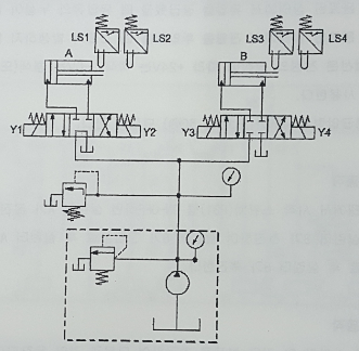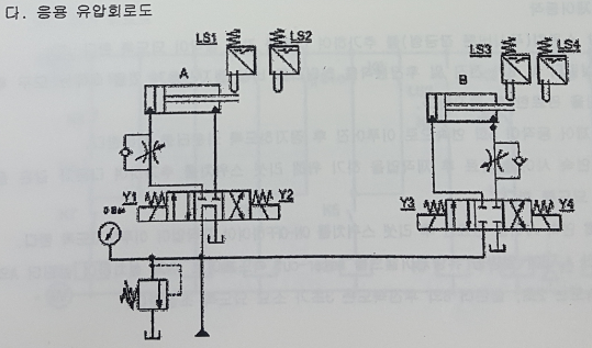 3) 실린더 A의 전진속도를 meter-in 방법에 의해 조정할 수 있게 유압회로도를 변경 조정하고, 실린더 B의 전진속도를 meter-out 방법에 의해 조정할 수 있게 유압회로도를 변경 조정한다.