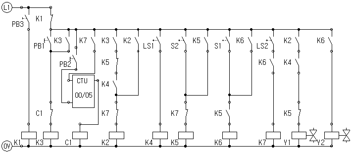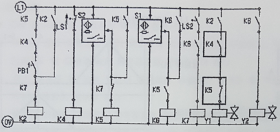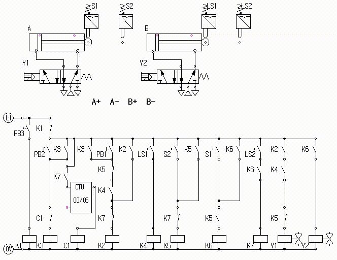 2) 초기상태에서 시작 스위치(PB1)를 ON-OFF 하면 변위-단계선도와 같이 실린더 A가 전진 및 후진을 완료하고 실린더 B도 전진 및 후진 동작을 완료한다.