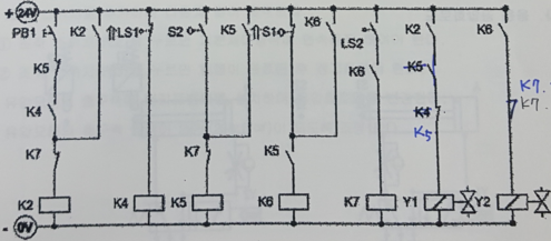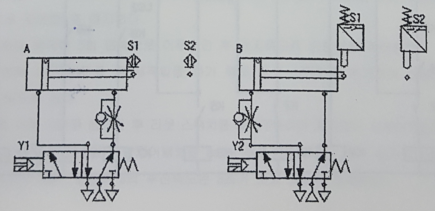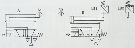 1) 공압 구성작업에서 실린더 A는 유도형 센서나 용량형 센서 또는 전기 리드 센서를 사용하고 실린더 B는 전기 리밋 스위치를 사용하여 구성하여야 한다.