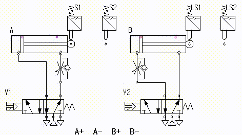 4) 실린더 A, B에 일방향 유량제어밸브를 meter-out 속도제어로 추가 설치하여 실린더 A의 전진속도는 2초, 실린더 B의 후진속도는 3초가 소요 되도록 조절한다.