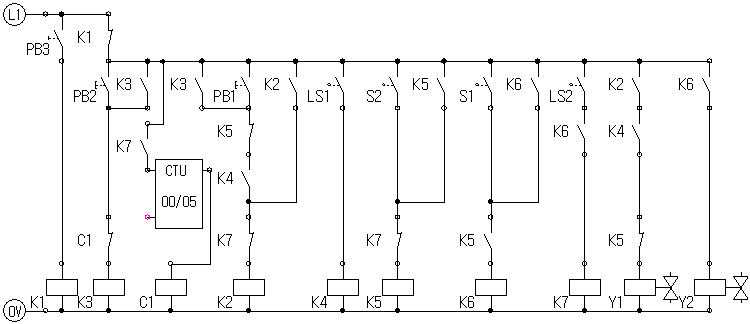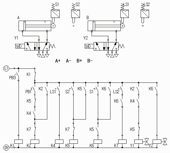 2) 초기상태에서 시작 스위치(PB1)를 ON-OFF 하면 변위-단계선도와 같이 실린더 A가 전진 및 후진을 완료하고 실린더 B도 전진 및 후진 동작을 완료한다.