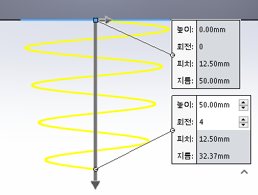 파라미터는 '일정피치'로 높이는 50, 회전은 4로 해준다.