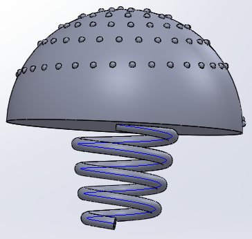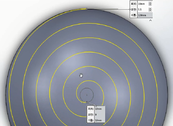 구의 위쪽 끝점에 기준면을 만들고 원을 만들어 원의 중심과 나선의 끝을 관통조건으로 일치시킨다.