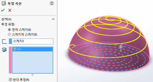 위로 투영을 해야 할 듯하다. 그런데 스케치가 아닌 곡선은 투영곡선이 먹히지 않는다.