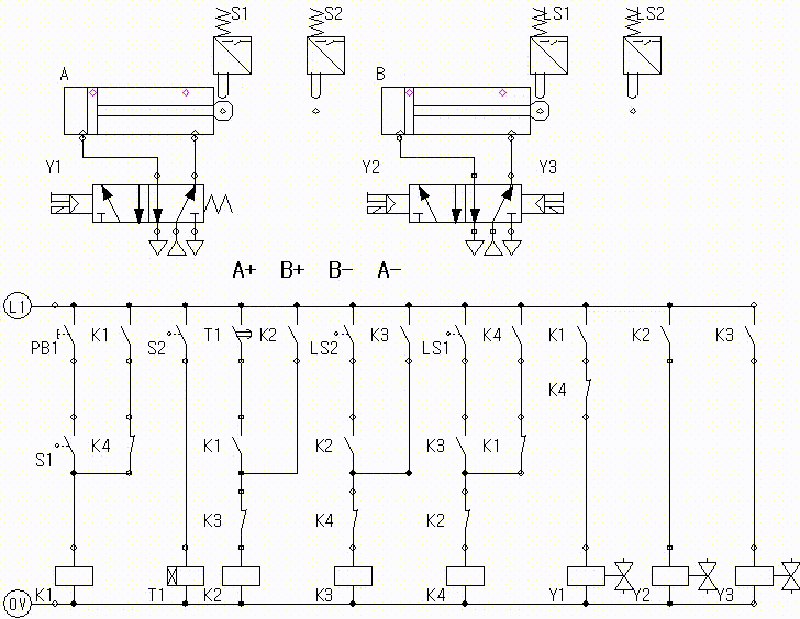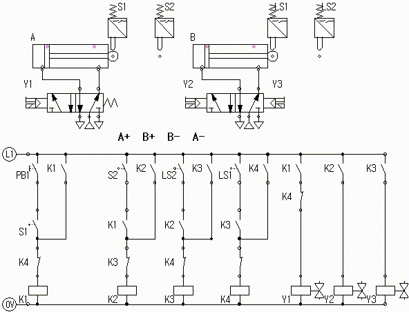 1) 초기상태에서 PB1 스위치를 ON-OFF 하면 변위-단계선도와 같이 실린더 A가 전진하고 실린더 A가 전진완료하면 실린더 B가 전후진 완료 후 실린더 A가 후진 한다.