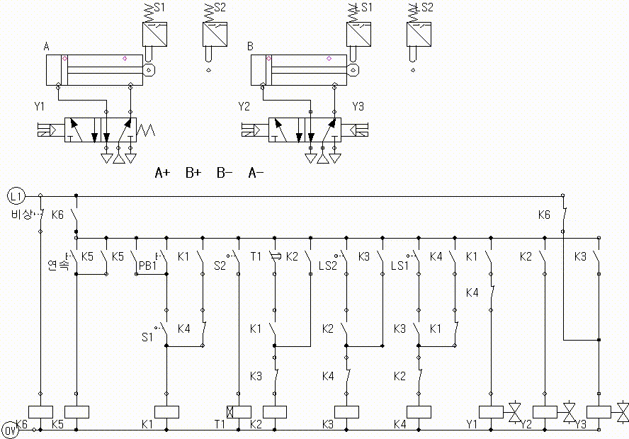 1) 초기상태에서 PB1 스위치를 ON-OFF 하면 변위-단계선도와 같이 실린더 A가 전진하고 실린더 A가 전진완료하면 실린더 B가 전후진 완료 후 실린더 A가 후진 한다.
