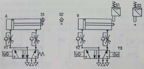 3) A실린더의 전후진 속도와 B실린더의 전후진 속도를 조절할 수 있도록 배기공기 교축(meter-out)회로를 추가한다.