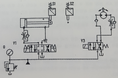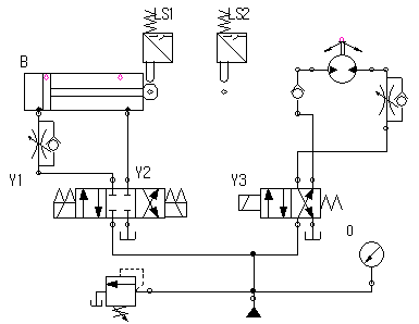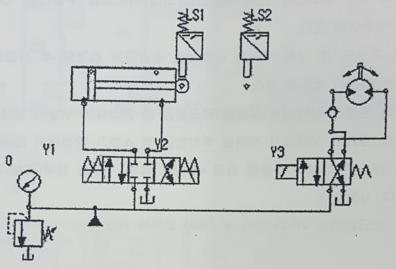 초기상태에서 PB2를 해제(OFF)한 후 시작스위치(PB1)를 ON-OFF하면 실린더 A가 전진하고 실린더 A가 전진완료 후 유압모터 B가 회전한다. PB2를 ON하면 실린더 A가 후진하고 유압모터도 정지하면서 램프 1이 점등된다.