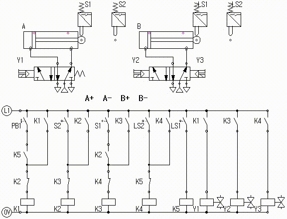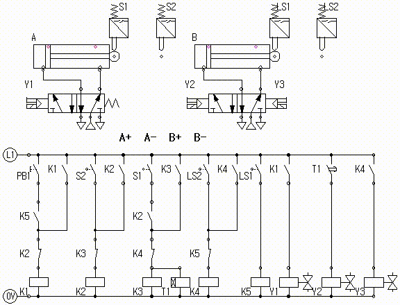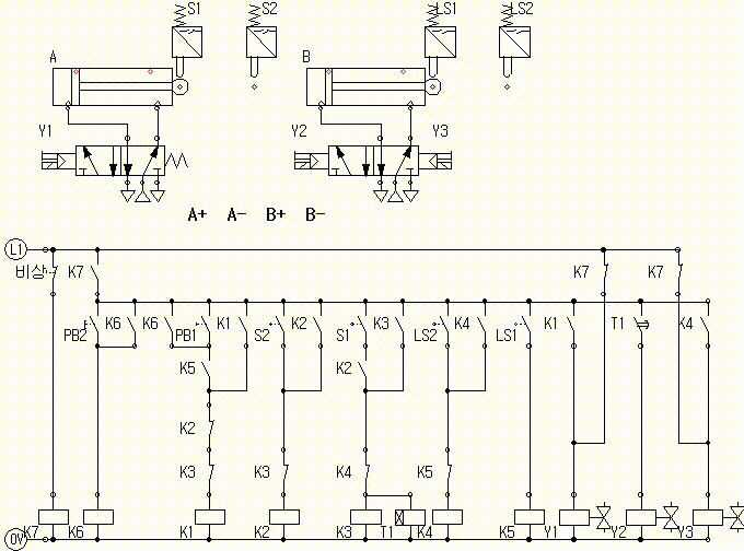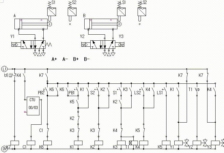 실린더 A가 전진하고 실린더 A가 전진완료 후 실린더 A가 후진하고 실린더 A가 후진 완료하면, 실린더 B가 전진하고 실린더 B가 전진 완료 후 실린더 B가 후진하고 실린더 B가 후진 완료하면 동작을 멈추고 정지한다.