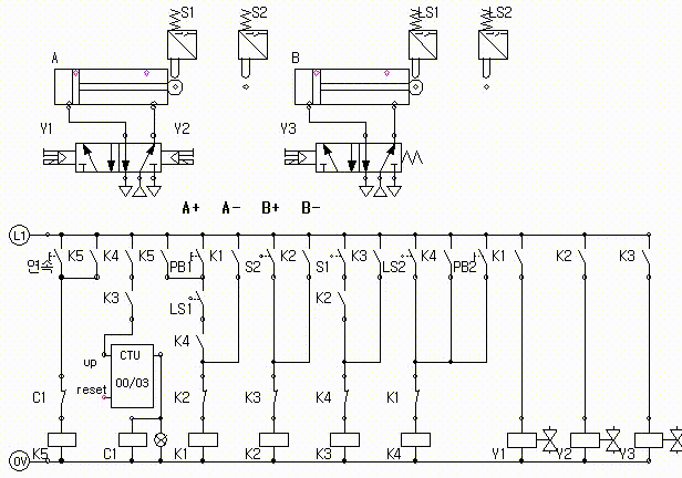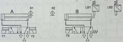 1) 공압 구성작업에서 실린더 A는 유도형 센서나 용량형 센서 또는 전기 리드 센서를 사용하고 실린더 B는 전기 리밋 스위치를 사용하여 구성하여야 한다.