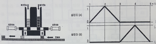 초기상태에서 PB2 스위치를 ON-OFF한 후 PB1 스위치를 ON-OFF하면 변위-단계선도와 같이 실린더 A가 전진하고 실린더 A가 전진완료하면 실린더 B가 전진 후 후진한다.