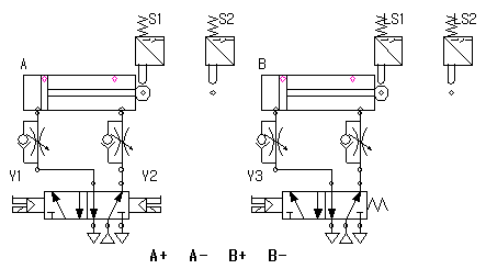 3) A실린더의 전후진 속도와 B실린더의 전후진 속도를 조절할 수 있도록 배기공기 교축(meter-out) 회로를 추가한다.