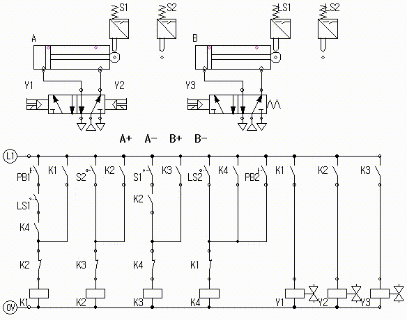 2) 초기상태에서 PB2 스위치를 ON-OFF한 후 PB1 스위치를 ON-OFF하면 변위-단계선도와 같이 실린더 A가 전진하고 실린더 A가 전진완료하면 실린더 B가 전진 후 후진한다.