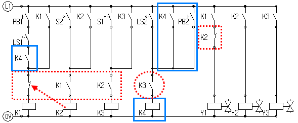 PB2를 눌러 K4를 자기유지시키고 K4 a접점으로 동작시작 지점을 연결시켜주면 된다.