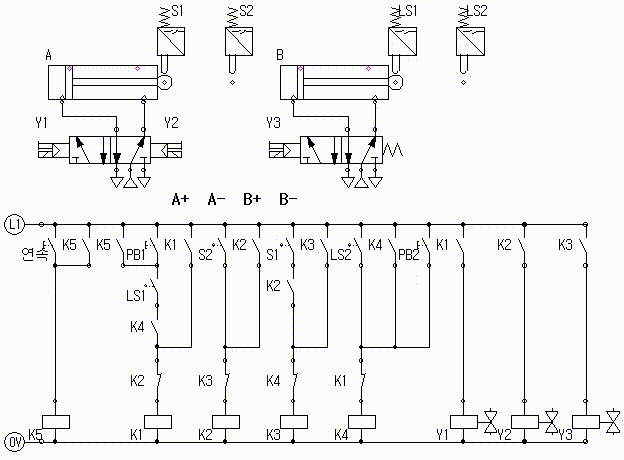 모범 답안에는 S2 밑에 K1 a접점이 LS2 밑에는 K3 a접점이 있고, Y1 솔레노이드를 끊어주는 K2 b접점이 있는데