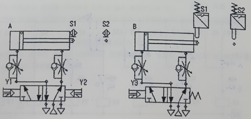 1) 공압 구성작업에서 실린더 A는 유도형 센서나 용량형 센서 또는 전기 리드 센서를 사용하고 실린더 B는 전기 리밋 스위치를 사용하여 구성하여야 한다.