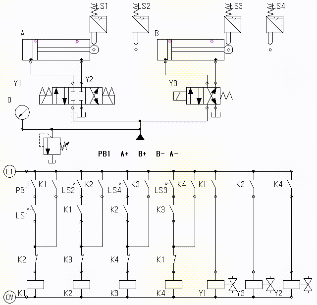 2) 초기상태에서 시작 스위치(PB1)를 ON-OFF하면 실린더 A가 전진하고 실린더 A가 전진 완료 후, 실린더 B가 전진 및 후진 완료하고 실린더 A가 후진한다.