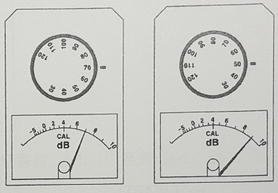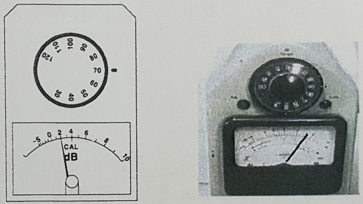 (소음측정기 측정값을 보여준다. 다이얼은 50을 가르키고 회전하는 바늘은 8과 10 사이를 가르킨다. 50+9=59dB 또 다른 값은 70+7 = 77dB