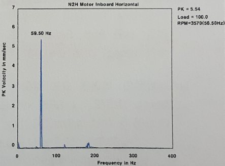 57. 화면은 모터 축방향에서 측정한 진동 스펙트럼을 보여주고 있다. 이 설비에서 발생하고 있는 결함 원인을 기술하고 대책을 세우시오.