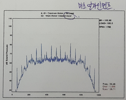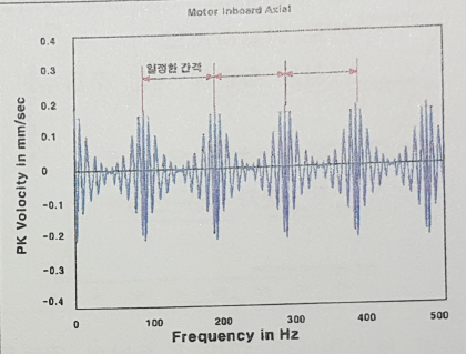 67. 모터측에서 측정한 소음 주파수이다. 이 설비에서 발생하고 있는 결함을 기술하시오.