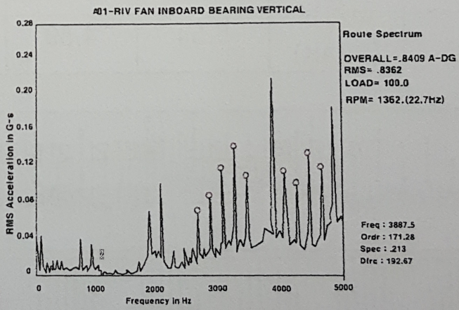 54. FAN부하 측에서 측정한 진동 값을 보여주고 있다. 이 설비에서 발생하고 있는 결함원인을 기술하고, 결함 주파수를 계산하시오.