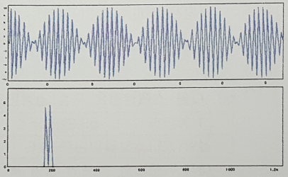 위에 있는 스펙트럼은 맥놀이 현상처럼 보이는 것이며 아래 있는 스펙트럼은 높은 곳이 하나였습니다.