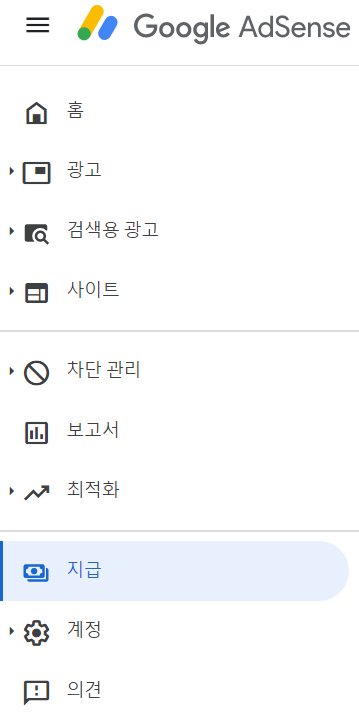 애드센스에 접속하면 왼쪽 메뉴화면 아래쪽에 '지급'을 누른다.