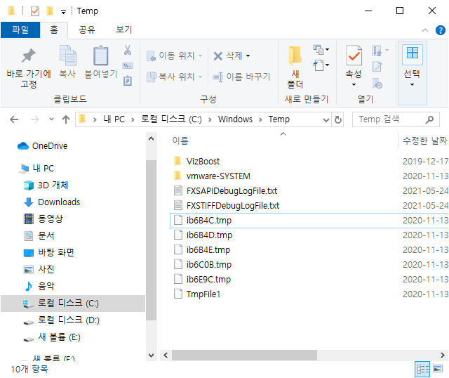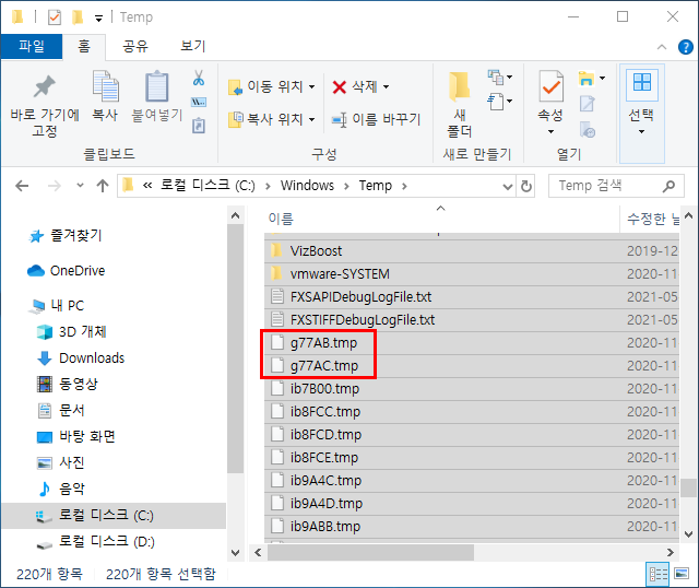 그래서 임시폴더의 내용을 삭제해 보았다.