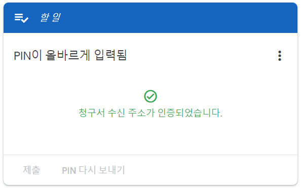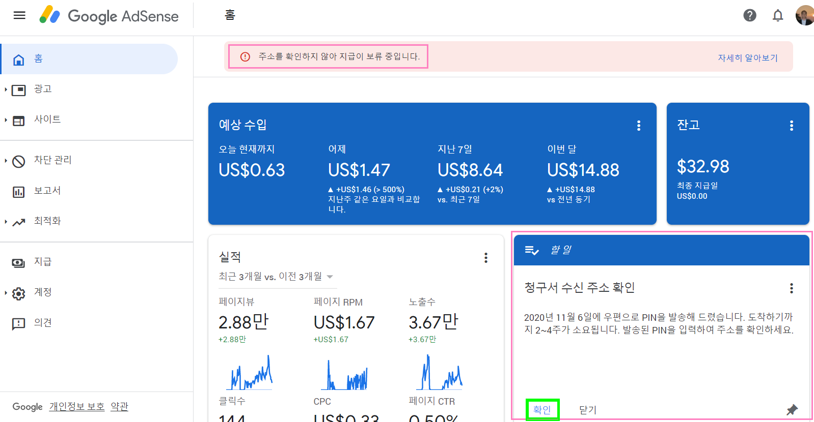 이제 구글애드센스 메인페이지를 보면 '청구서 주소 확인'란이 보입니다. 확인을 클릭해서 '핀번호'를 입력하면 됩니다.