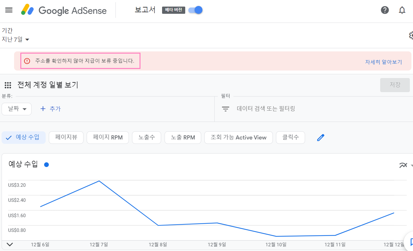 아래의 '주소를 확인하지 않아 지급이 보류 중입니다' 라는 메시지가 떠서 검색을 통해 알아보았습니다. 이 메시지는 광고수익금이 10달러가 넘어가면 뜨게 됩니다.
