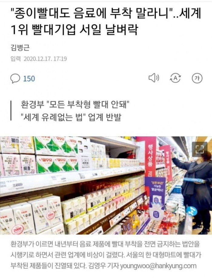 환경부가 이르면 내년부터 음료 제품에 빨대 부착을 전면 금지하는 법안을 시행키로 하면서 관련 업계에 비상이 걸렸다.