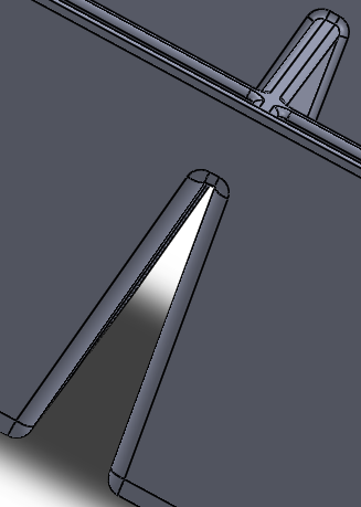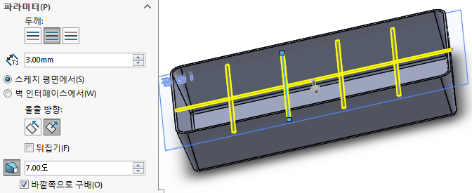 두께는 양면, 길이 3, 구배 7도 바깥쪽으로, 방향은 아래쪽으로 한다.