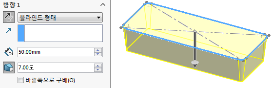 '피처-돌출보스'로 길이50, 구배 7도를 준다.