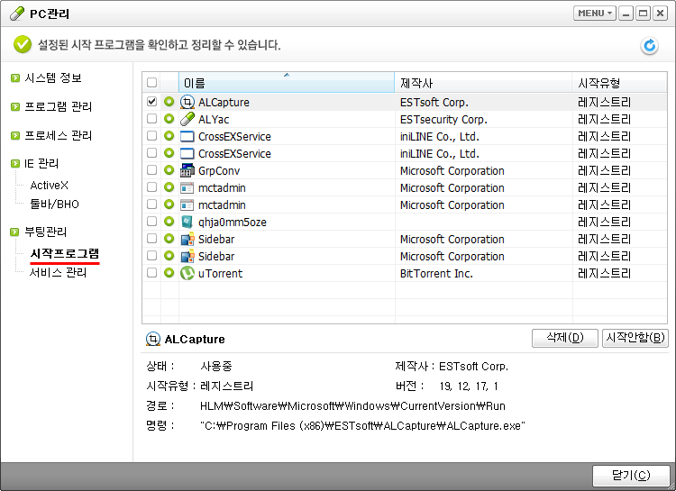 카카오톡, 알약 백신, 보안 프로그램들 ... 기타 필요없는 프로그램들