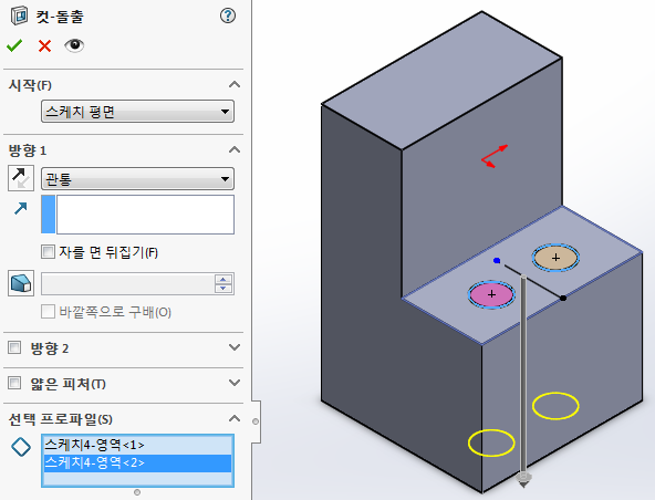 '돌출 컷'에서 아래와 같이 두 원을 선택하고 관통을 시킨다.